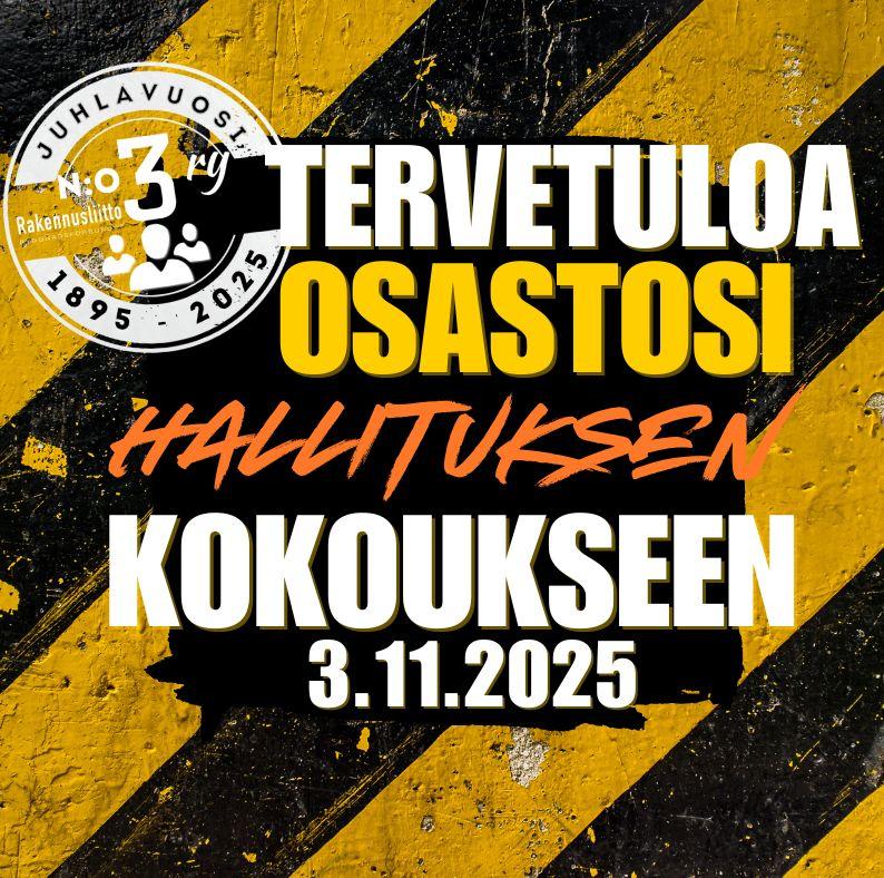 Maanantaina 3.2.2025 kello 17.00 alkaen Rakennusliiton osasto n:o 3 ry:n hallituksen kokous.