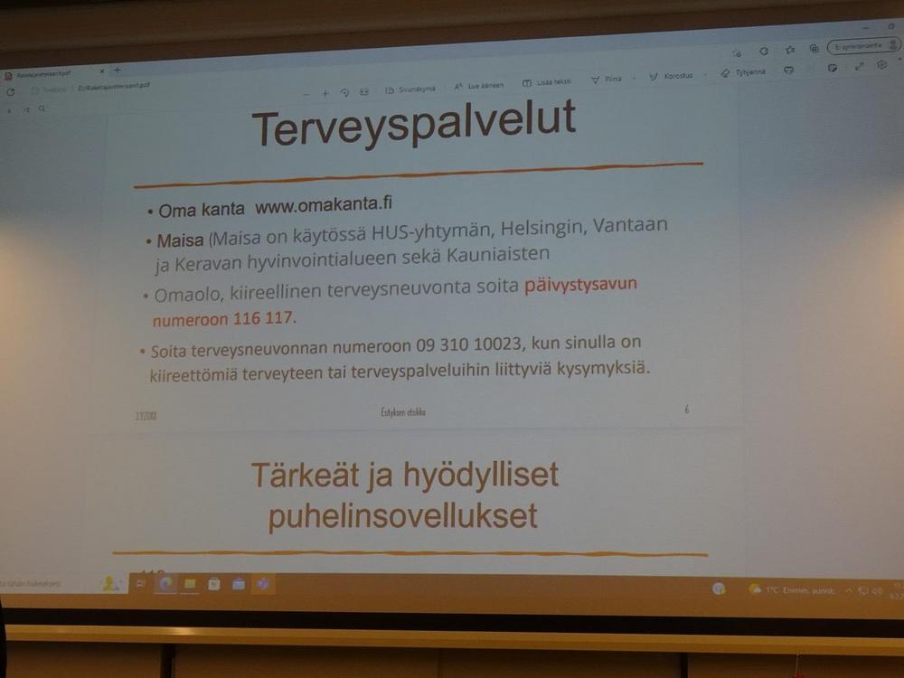 Aiheena oli tälläkin kertaa kännykkä ja tietokone asiat. Maarit opasti tarkoin meille juuri niitä asioita mitä eläkeläisille tarjotaan kännyköissä. Miten tulee suhtautua ”erikoistarjouksiin” ja muihin houkutuksiin. Monenmoista pakkomyyntiä tyrkytetään ja tarjotaan maksullisia ”lisäetuja” joita ei edes tarvita. Mielenkiintoinen ja tarpeellinen tilaisuus kaikin puolin. Uskon että aiheeseen vielä palataan toisenkin kerran.