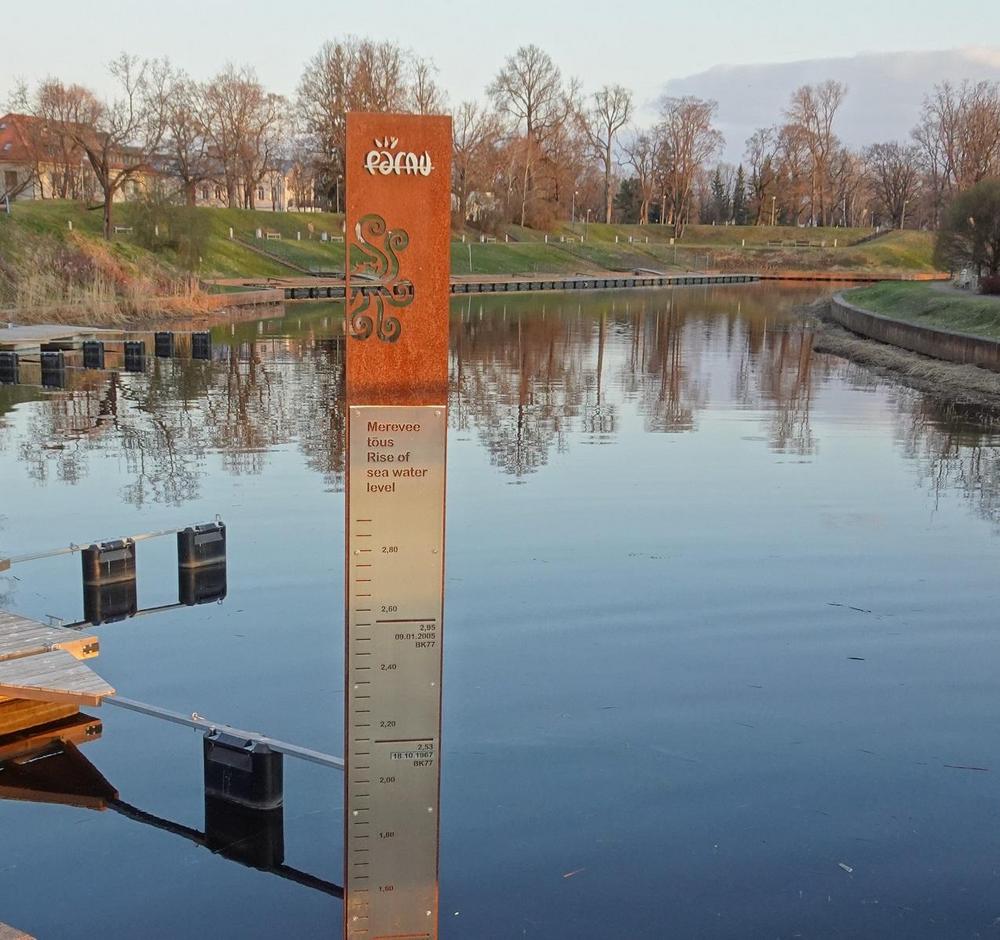 Näkymä Tervis-hotellin parvekkeeltä Pärny joelle jossa kalastajat palailevat verkoiltaan ja Tulvaraja 2.53 cm - 18.10.1967 Kuvat: Toivo Koivisto